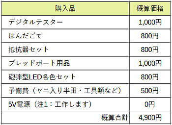 まず、予算5000円で最小限の部品を揃えます
