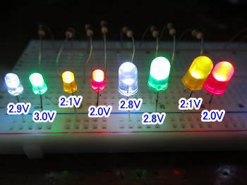 ほん数年前には、普通タイプのLEDと高輝度の白色LEDしかなかったので、テスターでLEDが生きていることを確認しながら「色」を見て、白くて明るければ3Vの高輝度タイプ、そうでなければ、2Vの普通タイプというように判断できましたし、2VのLEDでなければ3VのLEDと考えればよかったのです。