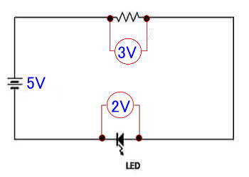 2VのLEDだと思って3VのLEDだった場合は、上で計算した300Ωの場合は、 A=V/R から、 (5-3)/300≒0.007A となって、LEDに流れる電流が少し減るので、LEDの劣化の問題はないのですが、 3VのLEDと思って計算した抵抗値で2VのLEDを点灯させる場合をみてみると、抵抗は200Ωを使うので、 オームの法則でその時の電流は、 A-V/R から (5-2)/200=0.0015A となり、少し流れすぎになってしまいます。
