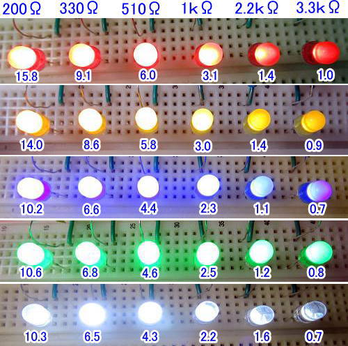 LEDの色によって発光材料が異なるので、順電圧も電流も異なりますが、LEDは15mA以下での使用が推奨されていますし、寿命を考えると、必要充分な明るさの抵抗値に変えればいいことがわかります。